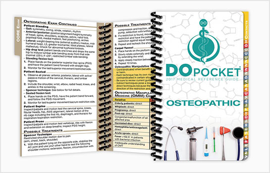DOpocket is a comprehensive pocket medical reference guide specifically designed to meet the demands of all osteopathic students and residents on rotation. This pocket medical reference focuses on osteopathic principles with diagnosis, treatment, and medications guidelines used by today's healthcare students/professionals and is guaranteed to improve your efficiency while taking care of patients. DOpocket merges the MDpocket student and resident books with modifications to fit the needs of all osteopathic students, interns, and residents.