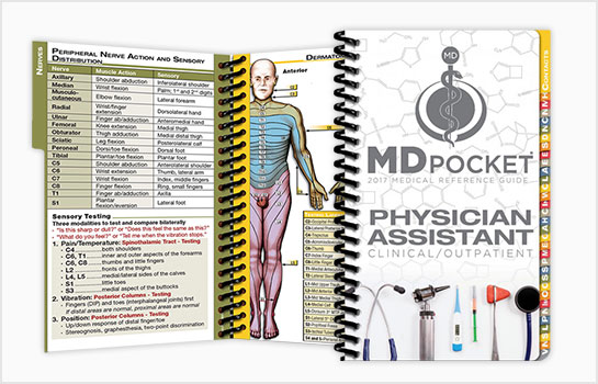 The Clinical/Outpatient Physician Assistant guide from MDpocket contains detailed pocket medical information for PAs working in clinics or outpatient settings. This compact pocket-size reference has information on writing and performing Physical Exams, assessing cardiac murmurs, cranial and peripheral nerves, strength testing, dermatome areas, EKG and CXR interpretation, stress testing, evaluating acute coronary syndromes, hypertension treatment, statin therapy, diabetes management and much more. This pocket reference provides over 100 pages of vital day-to-day medical treatments, management and workup specifically for a Physician Assistant or Physician Assistant Students.
